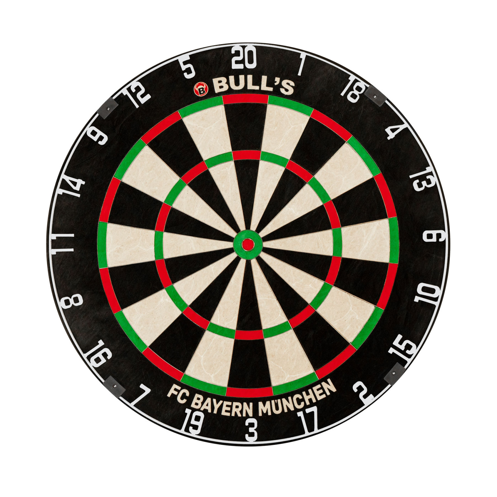 Optisch setzt das Board ebenfalls starke Akzente: Das BULLS Logo im oberen Bereich sowie der FC Bayern München Schriftzug im unteren Zahlenring verleihen dem Dartboard einen unverwechselbaren Look.